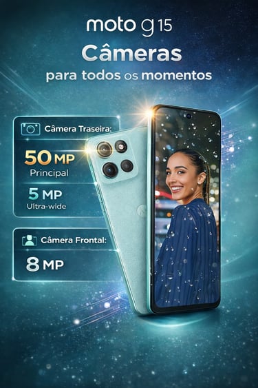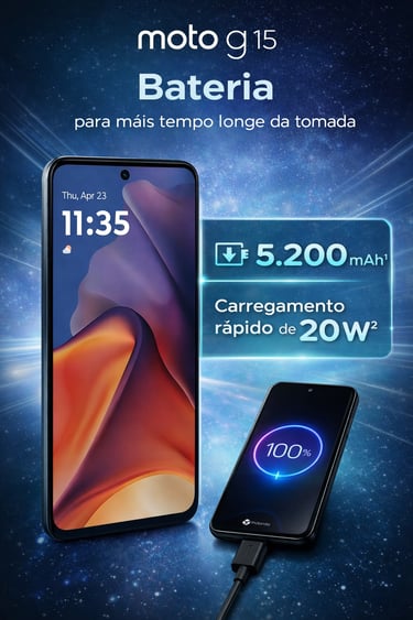 O Moto G15 é um smartphone focado no uso diário, ideal para redes sociais, vídeos, chamadas, aplicativos de mensagens e tarefas do dia a dia. Ele traz Android 15, design moderno e a confiabilidade já conhecida da Motorola.