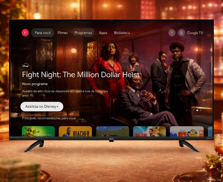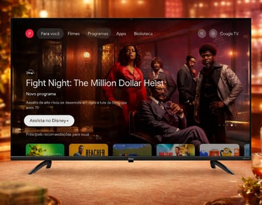 O sistema Google TV garante uma navegação fluida, com acesso à Play Store, permitindo instalar aplicativos como: